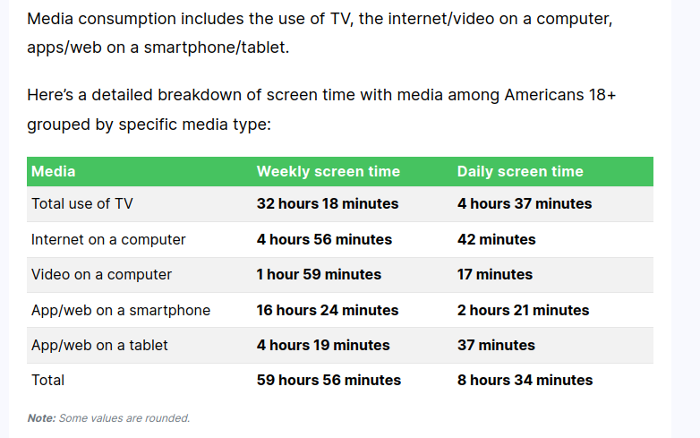 "Average weekly “screen time” between 1930 and 1950 would have been ~2-5 hours for a US adult attending a Cinema once a week (Pautz 2002). By the end of the 1950s, when more than 80% of US households owned a TV (Britannica 2022), the average weekly time spent watching TV was around 14 hours (Livingstone 2009). Today, the presence of smartphones and tablets, the increase in computer-based office work and the tendency to use multiple screens simultaneously means that the global average time an adult spends on a screen is around 72 hours per week (Kemp 2022), nearly two-thirds of their waking life." Source https://ualresearchonline.arts.ac.uk/id/eprint/21117/3/SmithEssexBedford_2023_Projections_accepted_preprint-3.pdf